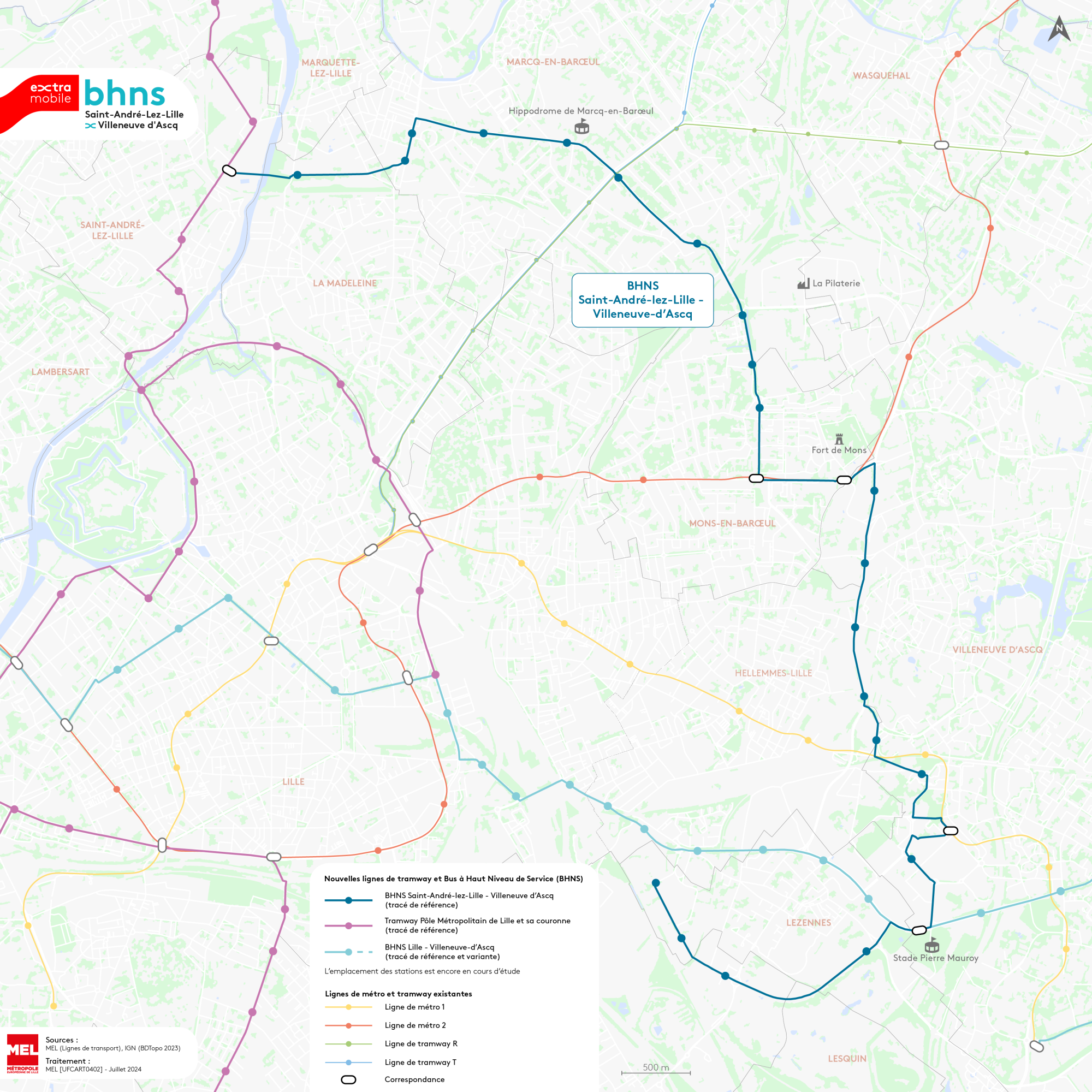 🚊 La carte du tracé du projet de BHNS de Saint-André-Lez-Lille – Villeneuve d’Ascq :